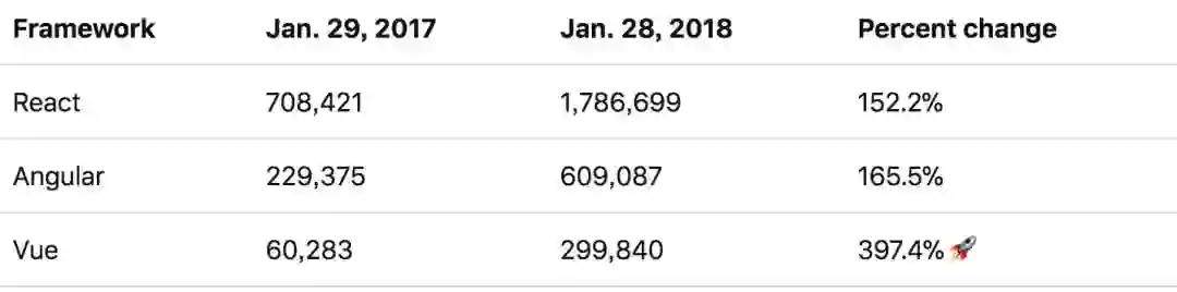 如果按目前的趋势继续下去的话,Vue 或将会在 2018 年底或 2019 年初取代 Angular ,成为使用率第二大的框架。