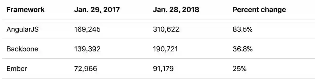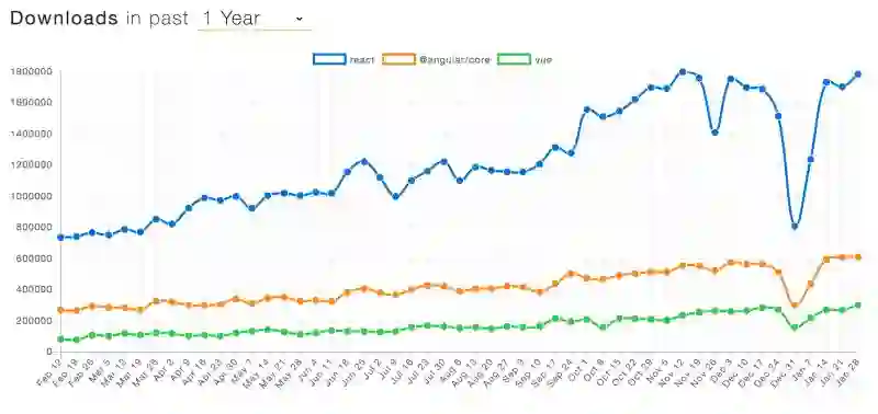 有意思的是,你会发现 AngularJS 实际上比 Vue 的下载量更高。Vue 在去年年底超过了 AngularJS ,但在今年 1 月的最新数据中,AngularJS 出现了较大的波动。当然,这不会影响 Vue 的长期趋势。
