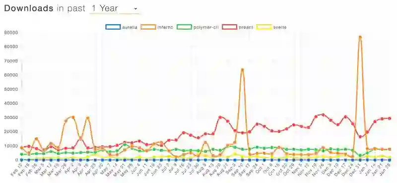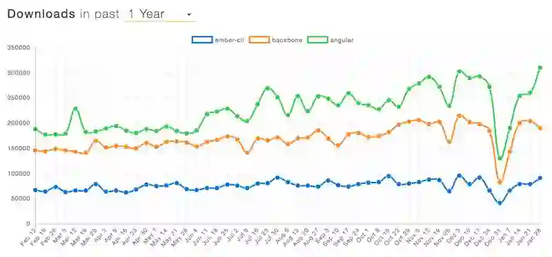 Javascriptreport 近日发布了一篇文章来比较流行前端框架的走势。走势图是通过统计最新的数据,并与前一年的数据进行比较而生成。数据来源于 npm trends 的每日下载量。
