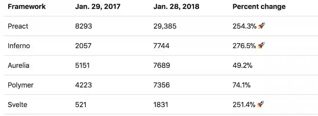 其中,Inferno、Preact 和 Svelte 的增长率仅低于 Vue 。Preact 是该梯队的领导者,有望成为最受欢迎的 React 替代品。