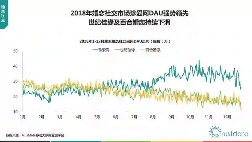 在推出实时视频相亲后,市场和用户对其的接受度均超过了珍爱网的预期。总体来说,视频相亲为用户提供的联动更为高效,令线上相亲变得更加有趣。经过一段时间的运行之后,已经可以成为继用户数据信息匹配之后的第二大主流连接方式。在对App进行改版后,易观数据的报告显示,2018年第一季度,珍爱网收入份额达到39.1%,市场规模上处于领先地位。trustdata发布的2018移动互联网行业报告中称,在婚恋行业领域,相较于行业内的其他玩家,珍爱网日活数据明显领先。
