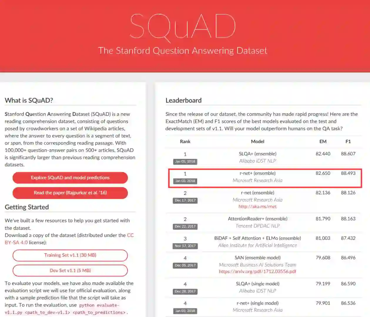在由斯坦福大学发起的SQuAD(Stanford Question Answering Dataset)文本理解挑战赛的最新榜单上,微软亚洲研究院自然语言计算组于2018年1月3日提交的R-NET模型在EM值(Exact Match, 表示预测答案和真实答案完全匹配)上以82.650的最高分领先,并率先超越人类分数82.304。