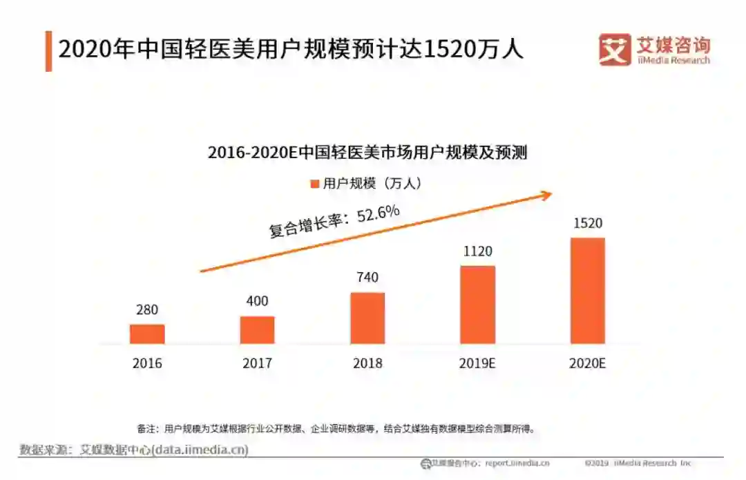 第三方咨询机构艾媒咨询发布的《2019年中国轻医美消费趋势研究报告》显示,2020年中国轻医美用户数预计将突破1500万人,复合增长率达52.6%。