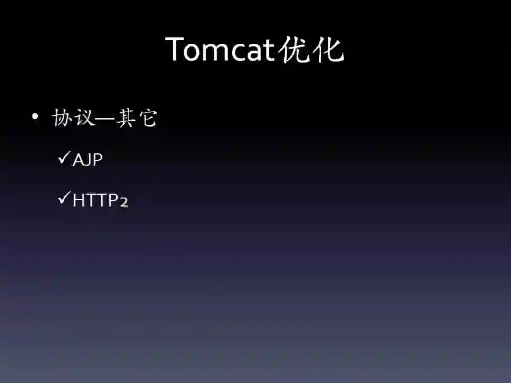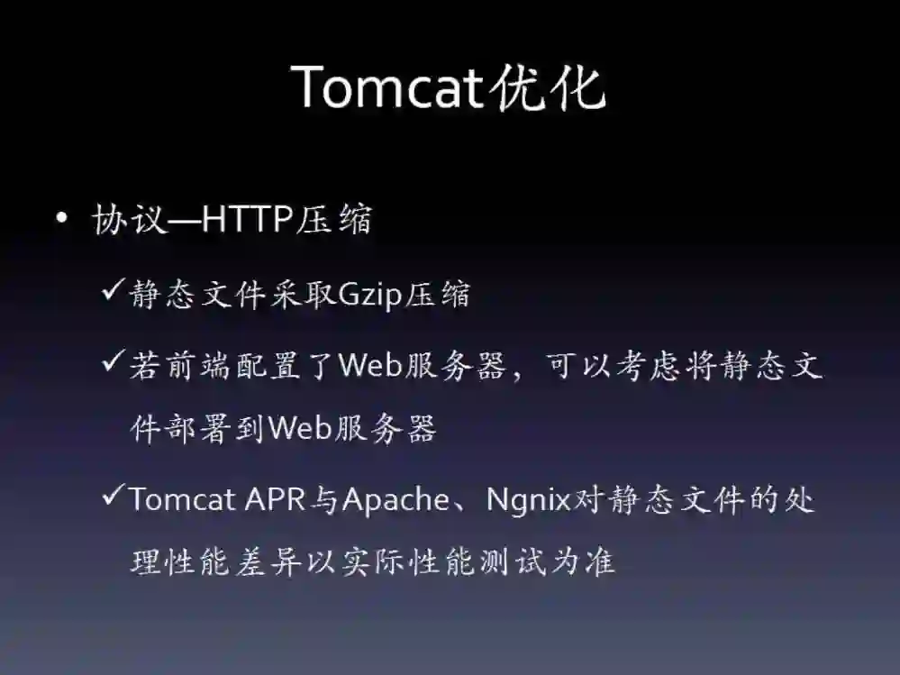 协议层面。这个最常见的就是开启HTTP GZip压缩。如果配置了前置的Web服务器,那么静态文件可以考虑直接放到Web服务器上,然后可以修改HTTP链接器的I/O方式。新版本的Tomcat默认是NIO,可以改为APR,后者可以充分发挥本地调用的优势,与直接使用Apache基本是类似的。