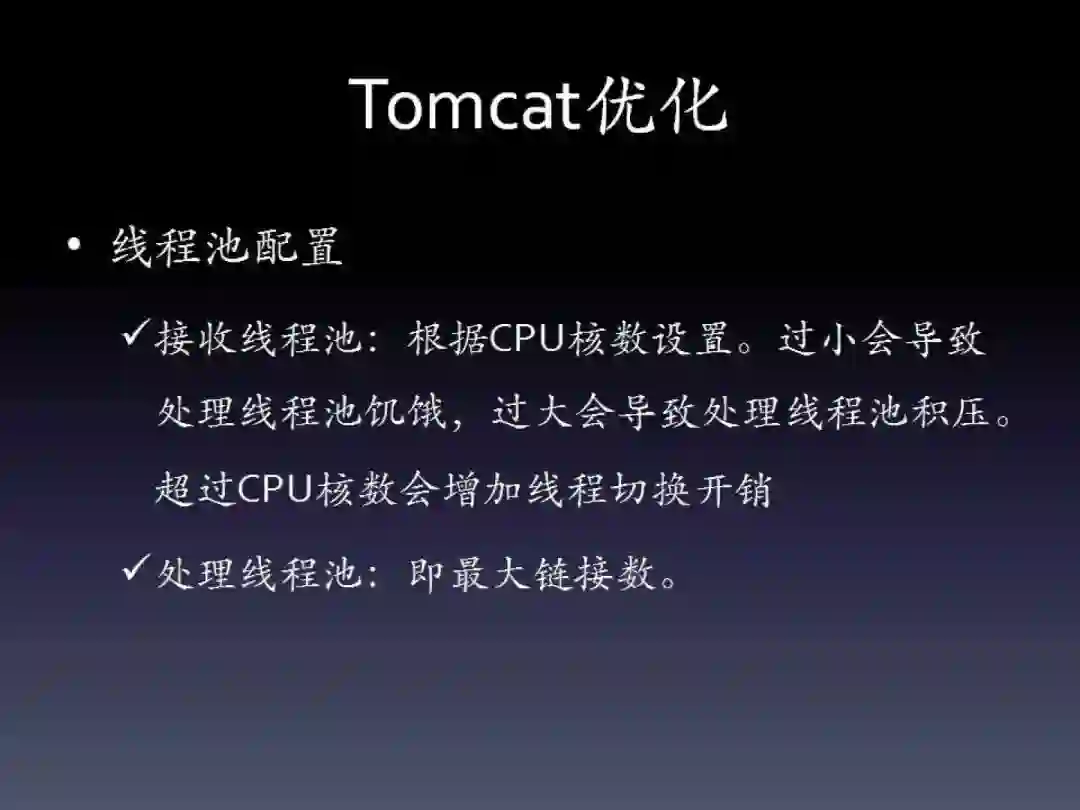 线程池就是我们刚才说的两类。接收线程池一般都是CPU内核数即可。当然如果服务器核数非常多,可以适当调小。这个线程池处理速度比请求处理线程池要快的多,因此要考虑这两者的匹配,原因PPT中都介绍了。