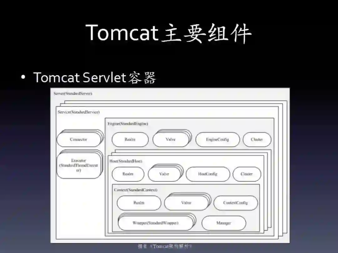 分层如下:Engine-Host-Context-Wrapper。引擎是顶级,我们可以认为就是容器本身。Host是虚拟主机的概念,这样可以在Tomcat配置多个虚拟主机。Context就是我们的Web应用,Wrapper是Web应用中的Servlet,所以还是刚才说的,Tomcat中的请求映射是体现到Servlet上。