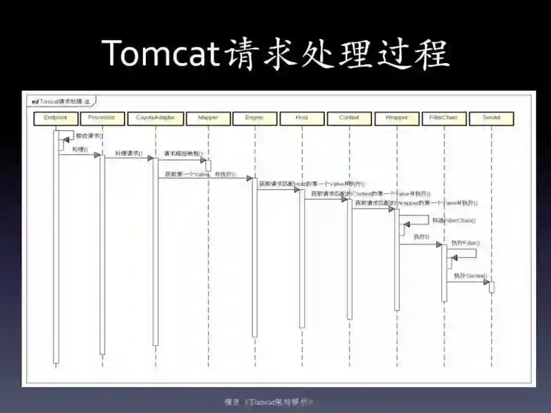 这是一张Tomcat请求处理过程的时序图,大家看一下就会发现。Tomcat在这种分层的容器设计方案下,请求处理是很简单的,重点在前期的请求接收及I/O处理(Processor的各种实现)、Mapper的映射以及Wrapper中的规范处理。