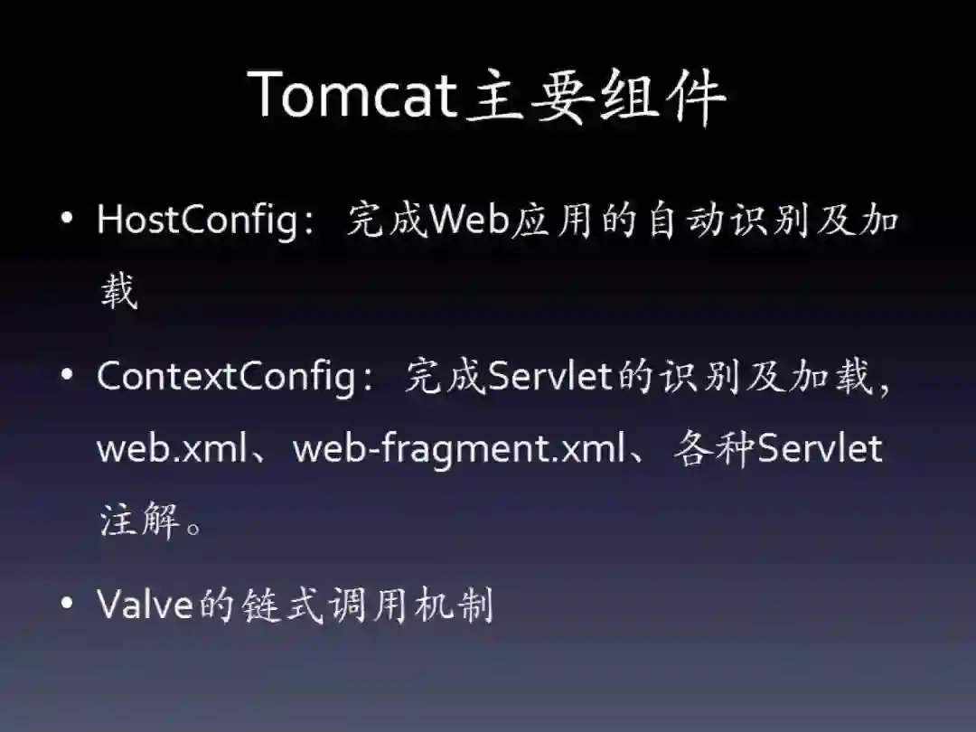 HostConfig主要用于扫描Web应用,自动根据Web应用目录创建Context。ContextConfig重点处理Servlet规范,生成Servlet、Filter等各种规范组件。最后,Tomcat自身也实现了一种链式的请求处理机制,这一点和规范中的Filter类似,这就是Valve。