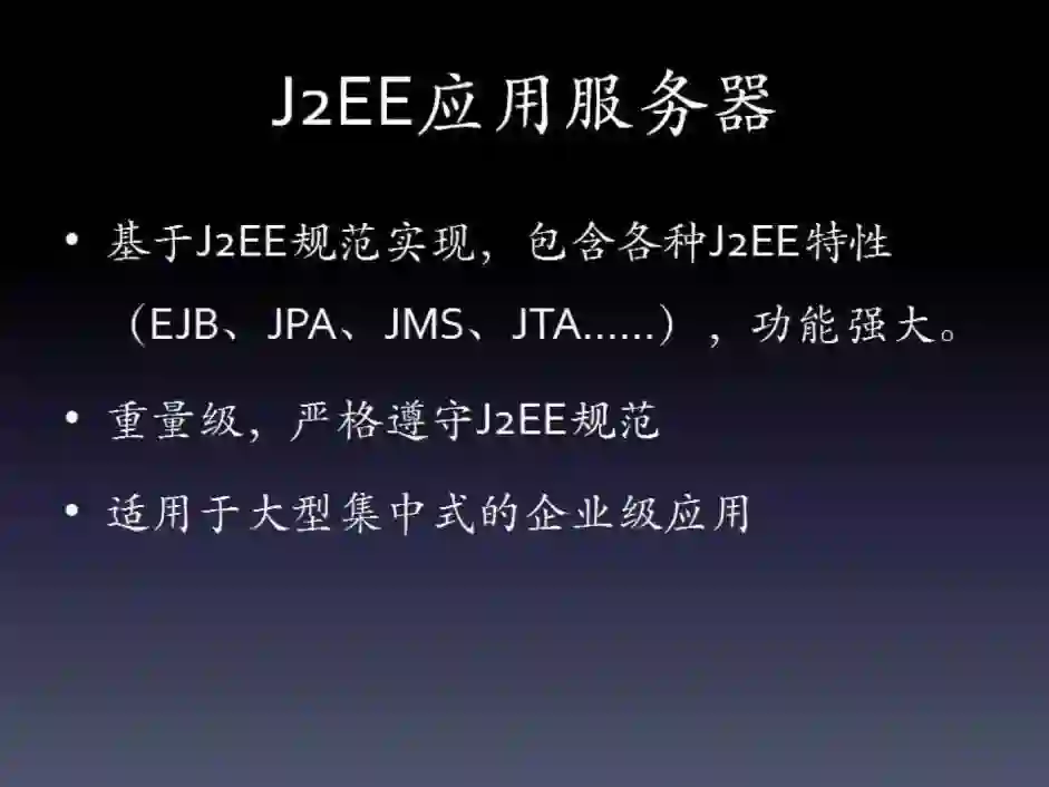 企业级应用服务器的特点就是过重。大概2010年之后(具体时间不确定),有几个转向了OSGi这种模块化架构,期望提供一种更加灵活的架构。像JBoss这一类产品在互联网规模化、轻量化的大背景下,似乎使用的相对越来越少。但是在集中式的企业级应用场景,它们应该还是主流,轻量级服务器是很难取代的。