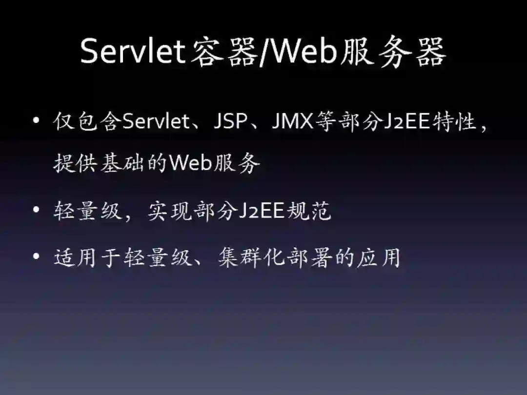 这是与互联网应用大规模分布式架构分不开的。在轻量级的架构中,绝大多数应用实际上主要使用了服务器的Servlet容器部分,其它部分很少使用,而是使用更完善的第三方框架去替代。这时候,J2EE服务器显得过重,所以开始更倾向于只使用Servlet容器提供HTTP服务。