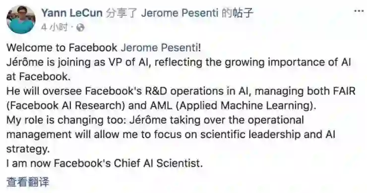 1月24日,据 Yann LeCun 在其 facebook 上确认,他将辞去由他一手创建的facebook人工智能实验室(FAIR)主任一职,担任首席AI科学家;其原有职位将由英国AI初创公司Benevolent的CEO、前IBM大数据集团CTO JérômePesenti接替。同时,Jérôme Pesenti还将接管Facebook的Applied Machine Learning(AML)团队。
