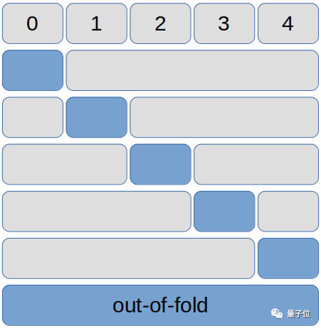 因为这些验证结果都是从没有在它们上面训练过的模型预测出来的,我们把这个五个验证折拼在一起的结果称为out-of-fold,包含整个训练集的验证结果(对应下图中的蓝色长块)。