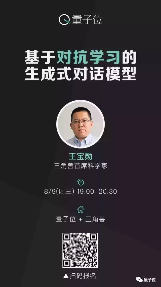 8月9日(周三)晚,量子位邀请三角兽首席科学家王宝勋,分享基于对抗学习的生成式对话模型,欢迎扫码报名 ▼