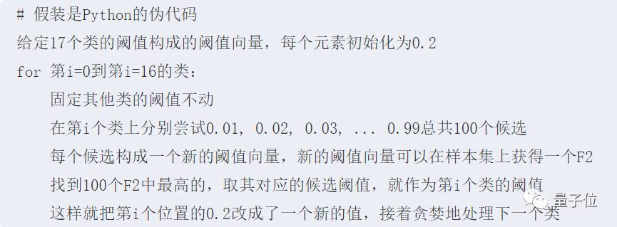 2. 在训练上述二分类任务时,由于正负样本数目不均衡,我们并不能直接拿p = 0.5作为二分类的阈值进行预测,而需要为每个类搜索一个合适的阈值,使得整体的F2-Score最大。具体来说,我们采取了讨论区放出的一个方案,贪婪地对每个类的阈值进行暴力搜索,逻辑如下: