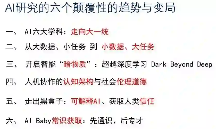 · 在学术界的发展,我刚刚在大会做了一个报告,题目是“人工智能:走向大一统的时代”。也就是说,AI的几大领域脱离了数理逻辑的表达和计算机制,经过20多年的摸索,找到了概率统计建模和随机计算这个新的数理基础,并在此基础上开始融合,走向一个大一统的格局。我自己在报告中初步总结了这么六个大的变局和趋势。