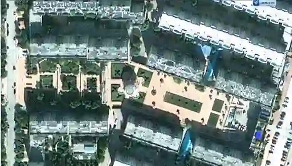 请注意图片中间左部的三个正方形区域,注意这三个正方形在俯视图上的不同体现,再加上正方形区域边上的那个长方形区域,基本上可以确定,这就是他所要找的目标小区。
