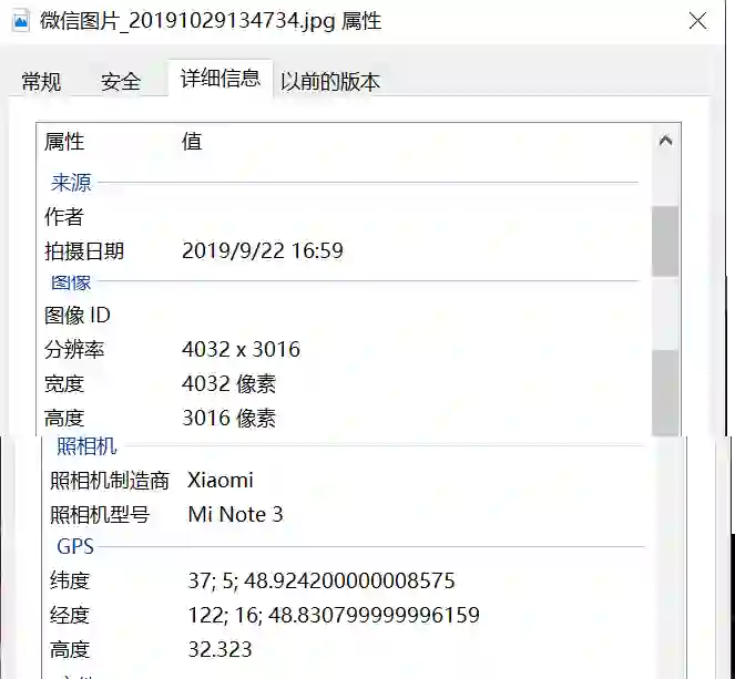 比如我在美国拍的那张照片,我在电脑端右键-属性-详细信息,就会看到以下信息: