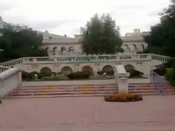 从以上照片可以分析得出这是西式小区,小区建成有一段时间,房子住在顶层,小区有三个同样大小的正方形花坛,正方形连线的一段是一个俯视图为长方形的拱门建筑。