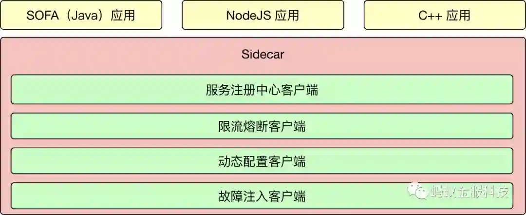 事实上,之前我们正是这么干的,蚂蚁金服内部之前就有一套用 NodeJS 搞的 SOFA 各个组件的客户端,但是最近几年随着 AI 等领域的兴起,C++ 也在蚂蚁金服内部也在被应用到越来越多的地方,那么我们是否也要用 C++ 再来写一遍 SOFA 中间件的各个客户端?如果我们继续采用这种方式去支持 C++ 的系统,首先会遇到成本上的问题,每个语言一套中间件的客户端,这些中间件的客户端就像一个个烟囱,都需要独立地去维护,去升级。另一方面,从稳定性上来讲,之前 Java 的客户端踩过的一些坑,可能其他的语言又得重新再踩一遍坑。