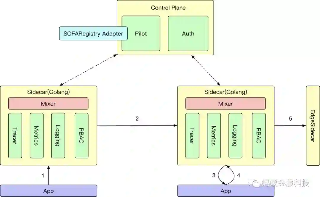 所以,SOFA Mesh 在整体的大图上大概是这样的,我们自研了一个 Golang 的Sidecar,并且把 Mixer 纳入到 Sidecar 中,来防止出现类似于 Istio 那样的性能问题,在 Pilot 和 Auth 这两个角色了,我们选择直接使用Istio 的,然后在上面做一定程度的适配,适配到蚂蚁内部的环境中,然后我们在整个部署上,新增了一个 EdgeSidecar 的角色,来解决跨环境的服务调用的问题。
