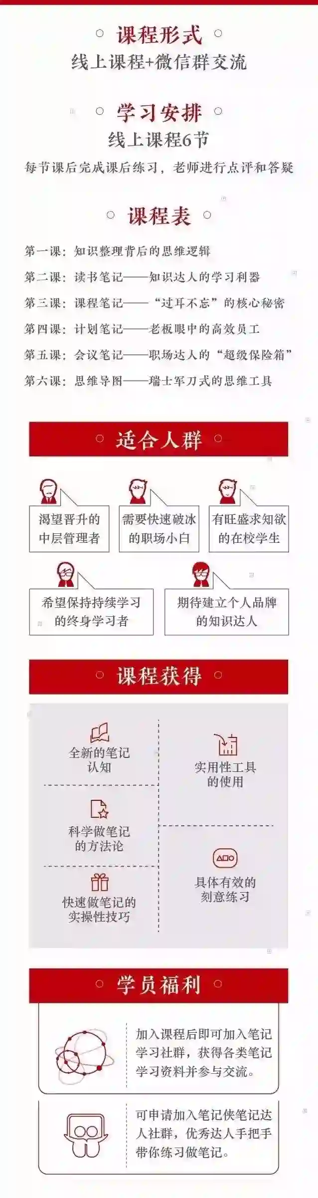 从学习做好笔记开始,通过学习一套简单实用的知识整理和工作方法,在实践中刻意练习,获得属于自己的知识体系,实现学习能力和效率的提升;在获得更出色的学习能力之后,才有可能冲破现有的生存束缚,拥有更优质的生活。
