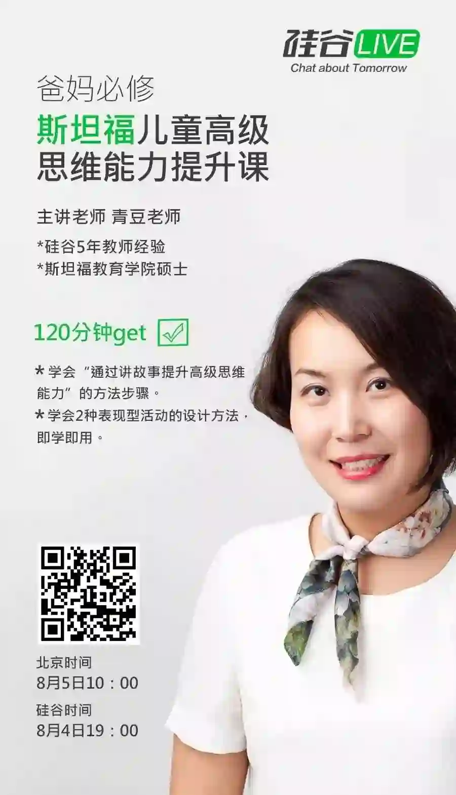 如何让孩子获得高级思维能力,本期硅谷Live,我们就邀请到了斯坦福大学毕业生,在硅谷有5年名校教学经验的青豆老师,来谈谈如何在讲故事的过程中培养孩子的“高级思维能力”。