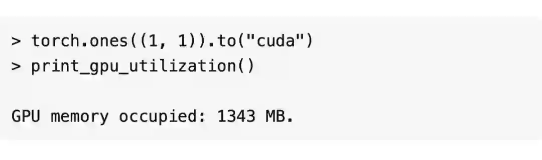 除此之外,CUDA kernel 也会占据一些 RAM,大概 1.3GB 左右,查看方式如下。