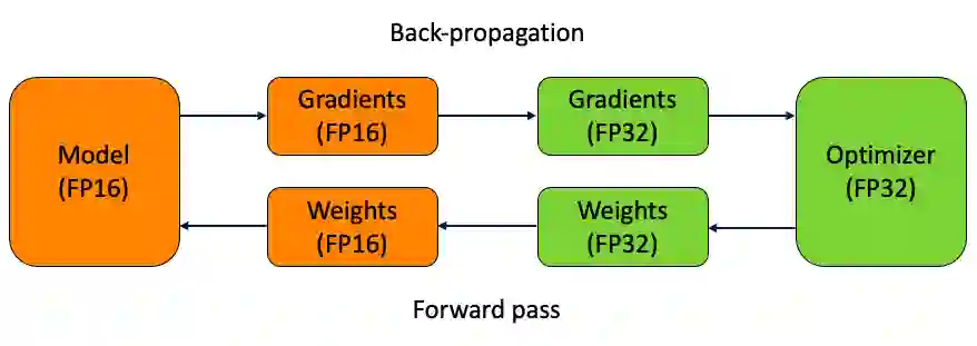 混合精度训练的大致思路是在 forward pass 和 gradient computation 的时候使用 fp16 来加速,但是在更新参数时使用 fp32。