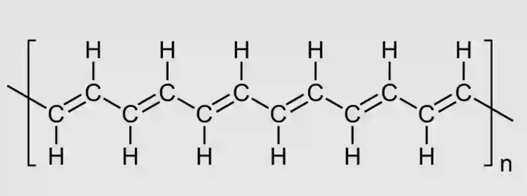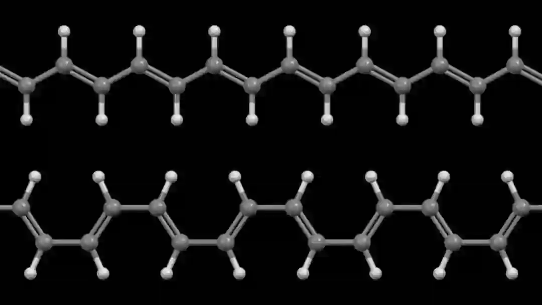 聚乙炔中的原子通过共价键结合在一起。单键意味着两个原子共用一个外层电子,双键表示共用两个电子。聚乙炔链中碳原子之间的单键和双键交替,使得该分子成为物理化学中一个有趣的研究对象。