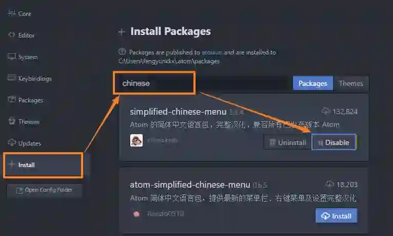 (你可以在 Atom 的 File → Settings → install 中看到这个目录的具体位置)
