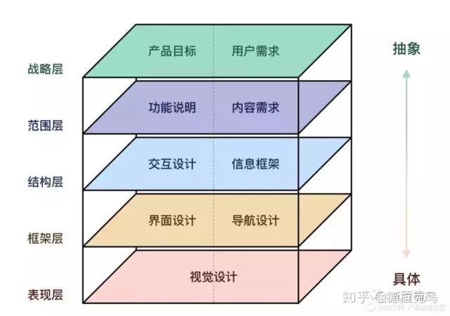 从产品体验要素五层理解去信息架构,则它存在于结构层、框架层、表现层,并且也是由该三层分别不同的元素:交互设计、信息框架、界面设计、导航设计、视觉设计等组成。