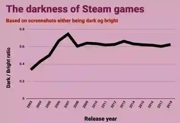 这项数据也是根据Steam的众多截图分析得出,可以看出近年来Steam的游戏暗度一直保持在60%左右。