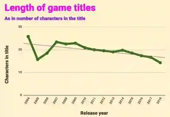 数据显示,早在2004年时,Steam上游戏的平均名字长度为25.7个字符,到了2017年这个数字下降到了16.6个字符。也就是说,Steam越来越短了。