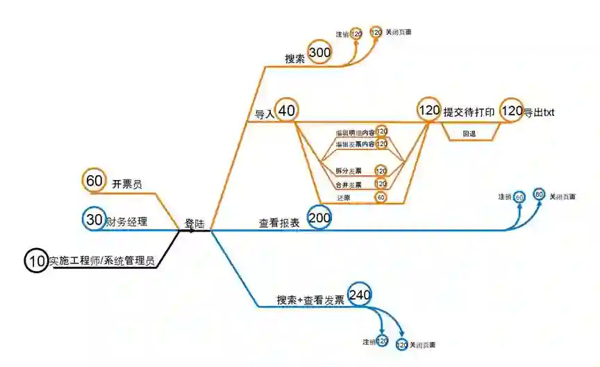 通过对这些真实用户数据的分析,可以设计更有效的性能测试模板,下面是一个性能测试模板的样例,其中每个功能点上圆圈中的数字代表这个功能点在真实环境中的用户访问权重。权重越大的功能点在整个性能测试模板中应该测试量更大,所花费的成本更高。