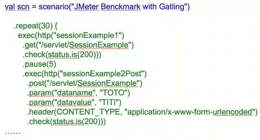 性能测试脚本易读,易维护。比如代码化的脚本Gatling,Locust等。下面是Gatling的DSL示例代码: