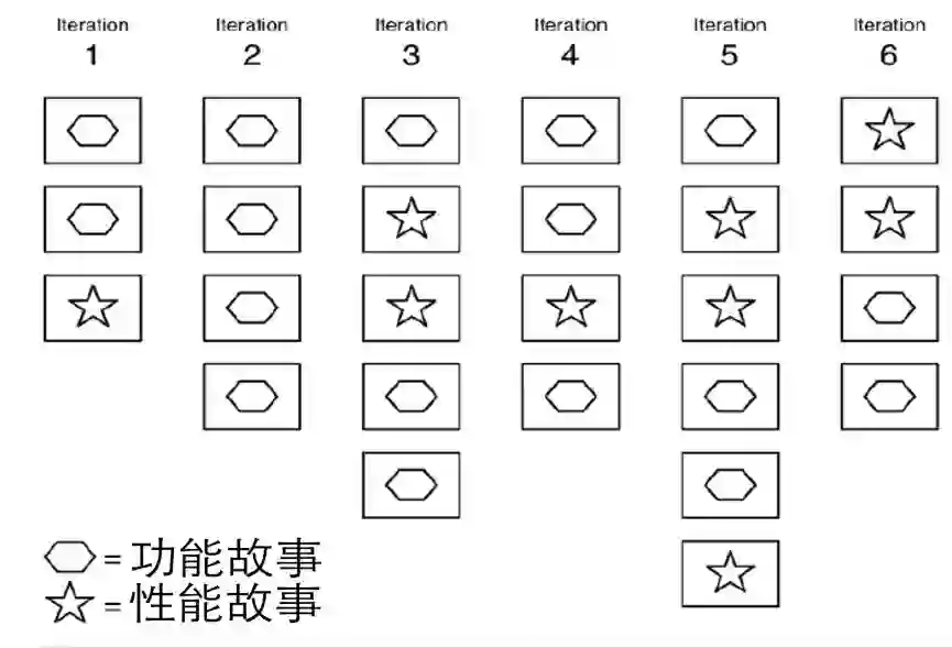 性能测试是持续集成和持续发布的一部分,尽可能早的发现性能问题,从而降低修复成本。这样可以使得很多性能问题在开发过程中被持续的尽快发现。建议将性能测试写成故事放到每个迭代里面去,见下图: