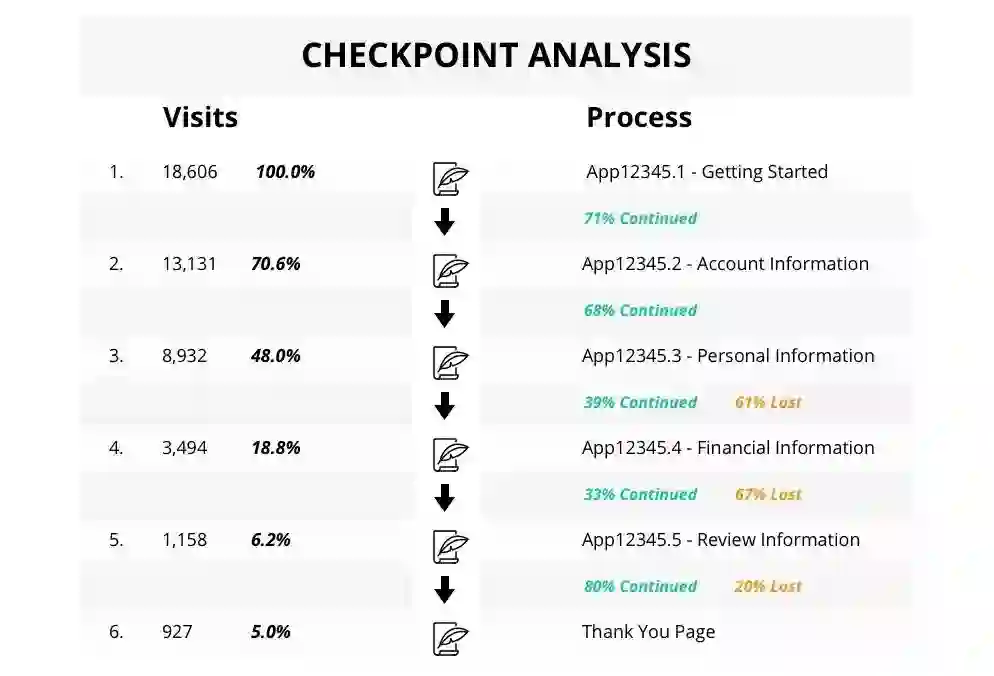 其中第一个步骤有18606次访问,然后有71%的访问用户选择继续,但是只有13131(70.6%)到达了第二个步骤。最终只有925(5%)的用户完成了注册。由此可以知道不同步骤的真实访问比例,从而得到性能测试的数据模型和策略。