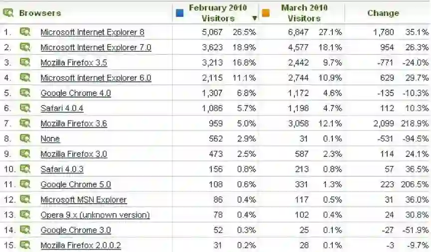 第二个例子是用户使用的浏览器的数据统计,如果性能测试需要模拟不同的浏览器,那么这些数据分析结果也可以用以确定浏览器在性能测试中的权重。