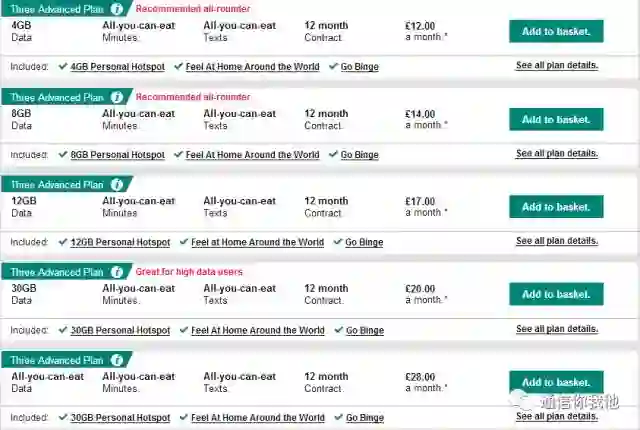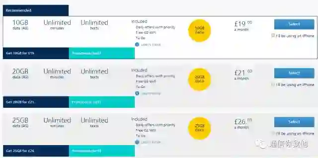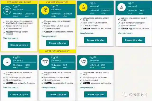 为了更好的对比四家运营商的通信资费,我们以几家运营商所推出的Pay Monthly SIM Plans作为例子进行对比。
