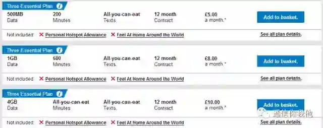 Three的套餐分为价格较便宜的Essential Plan和价格较贵的Advanced Plan两大类。以Essential Plan为例,最便宜的套餐每月仅需5英镑(约合人民币43元),包含500MB手机流量,200分钟通话时长以及无限制的短信条数。而最贵的套餐每月也仅需10英镑(约合人民币86元),包含4GB手机流量,无限通话分钟数以及无限短信条数。当然,套餐的适用范围是全欧洲,这一点和英国其他运营商一样。