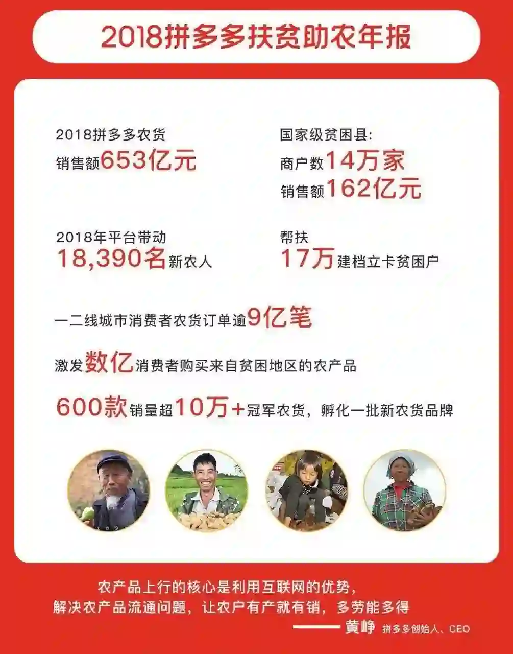 此前,拼多多创始人、CEO黄峥在出席第五届世界互联网大会,就“网络公益与扶贫”发表主题演讲时曾表示:“电商企业参与扶贫工作,核心是利用互联网的优势,解决农产品流通问题,让贫困地区有产就有销,多劳能多得。”
