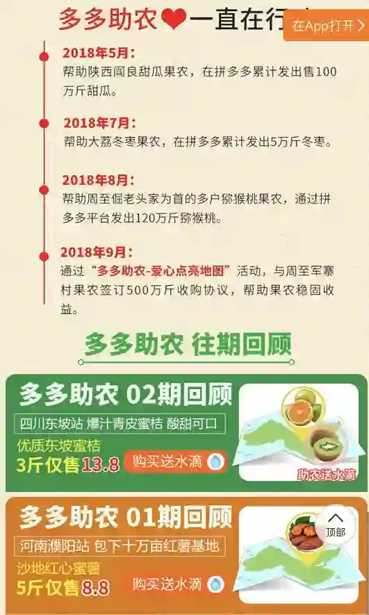 2018年拼多多上线多款产品尝试创新助农扶贫,其中5月上线的“多多果园”,可以让用户在线上虚拟的果园中种下树苗,并以社交、互动方式育果。果实成熟后,用户将免费收到一份由拼多多寄出的扶贫水果,其大多来自四川大凉山、新疆南疆等国家脱贫攻坚的重点地区。目前,多多果园每天送出的水果已经超过100万斤,消费者种下的每一株果树,都代表着贫困地区果农有望实现增收。