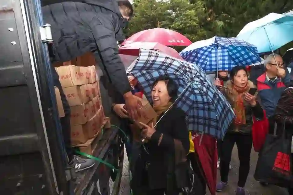 2018年12月9日,上海虹霞小区内的花园内,百名居民在雨中排成一条长龙,领取刚到货的秭归脐橙