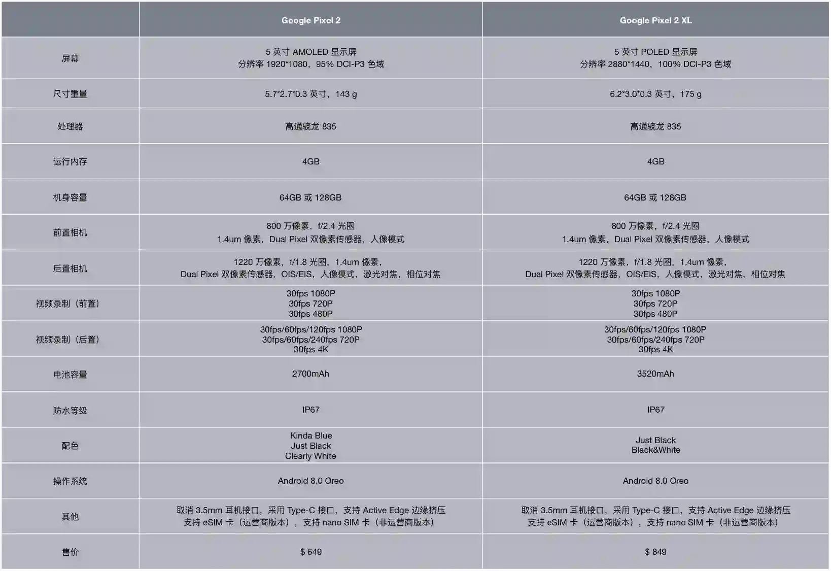 作为本场发布会中最重量级的产品,Pixel 2 和 Pixel 2 XL 在配置及外观方面与此前的爆料(谷歌钦定「全面屏」:直接对标 iPhone X)保持一致。配置方面,Pixel 2 和 Pixel 2 XL 均使用了高通骁龙 835 处理器,配备 4GB RAM,有 64GB ROM 和 128 GB ROM 两种规格可供选择,详细参数已为大家整理如下: