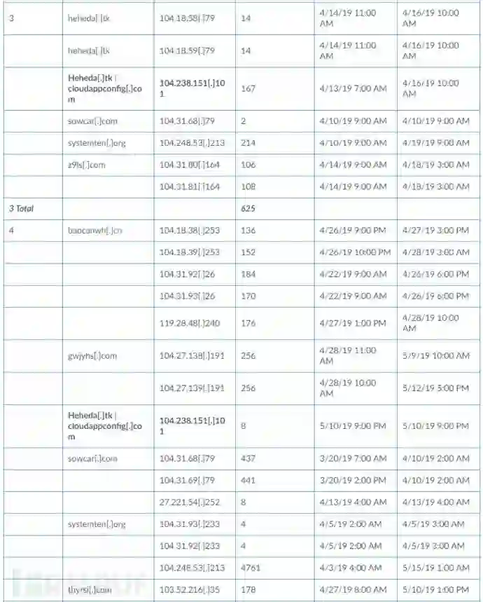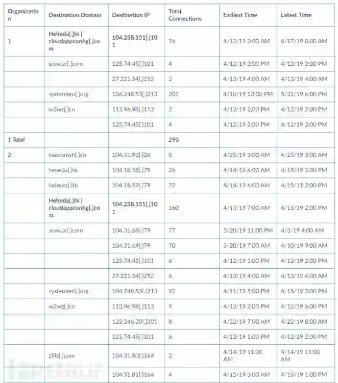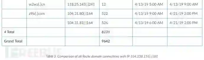 从104.238.151.101推断,这四个组织也与其他已知的Rocke域相关联。 组织1在2019年4月12日至5月31日期间连接到三个Rocke域,有290个连接。 组织4在2019年3月20日至5月15日期间连接到7个域,具有8,231个连接。 如表3所示,四个组织在与Rockede的硬编码IP地址104.238.151.101连接的时间段内连接到七个已知Rocke域中的一个或多个。