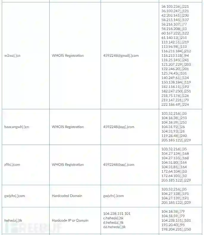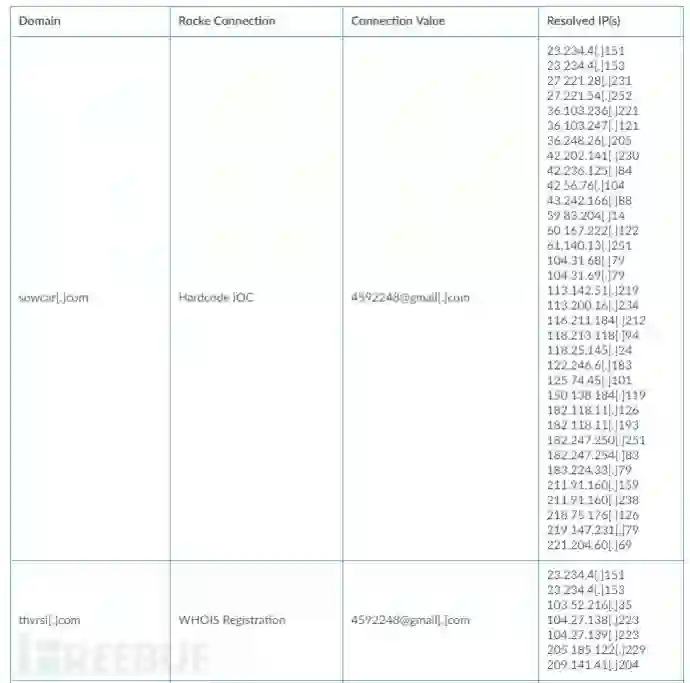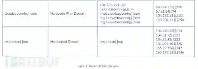 Rocke通过硬编码IP地址,URL地址、域名注册与受害人进行连接,将8个域与Rocke C2操作联系起来。 下图列出了域和Rocke基础架构(参见表1)。