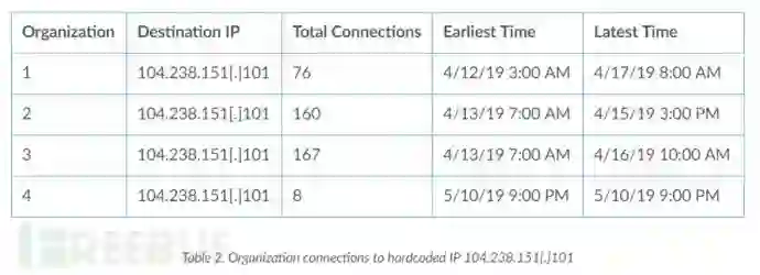 这些URL与Godlua和Reddit报告中的URL一致,与此IP地址任何连接都应被视为恶意连接。 研究人员确定了来自四个受监控组织的411个连接,这些组织与IP地址104.238.151.101建立了八个或更多的网络连接。 组织1中,第一次看到的连接和最后看到的连接之间的最长时间是五天,单个连接的最短时间为组织4的一小时(见表2)。