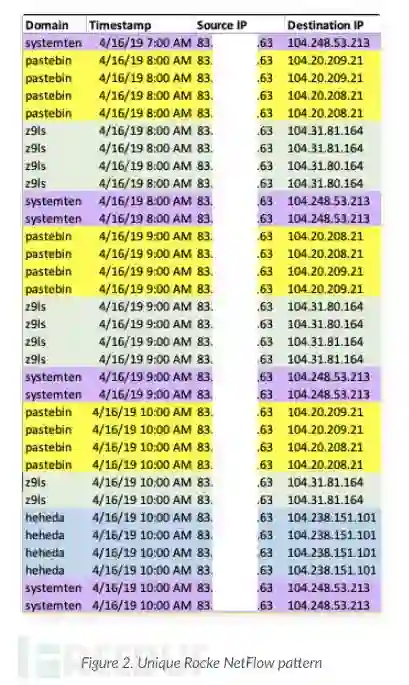 在查看NetFlow数据中的Rocke网络流量时,会出现一种截然不同的模式(参见图2)。首先,使用Pastebin建立连接,然后连接到Rocke域。从图像中可以看出,该模式每小时重复一次。此外,图2显示了连接到Pastebin,然后连接到已知的Rocke域,z9ls.com和systemten.org,在同一时间内连接到硬编码的IP地址104.238.151.101。此模式为第三阶段恶意软件活动功能特点,表示信标或心跳样式的活动。