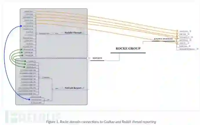 正如Godlua分析报告中所见,IP地址104.238.151 .101和URL d.heheda.tk,c.heheda.tk和dd.heheda.tk为硬编码。 发布到Reddit的与Rocke组织有关的恶意软件中也发现C2连接被发送到三个heheda. tk域,这些域已解析为IP地址104.238.151.101。 另外,样本包含已知的Rocke域sowcar[.]com, z9ls[.]com, baocangwh[.]cn, gwjyhs[.]com,和 w2wz[.]cn.的硬编码值。有关如何将已知的Rocke域与从Godlua和Reddit IoC报告中提取请参见图1。