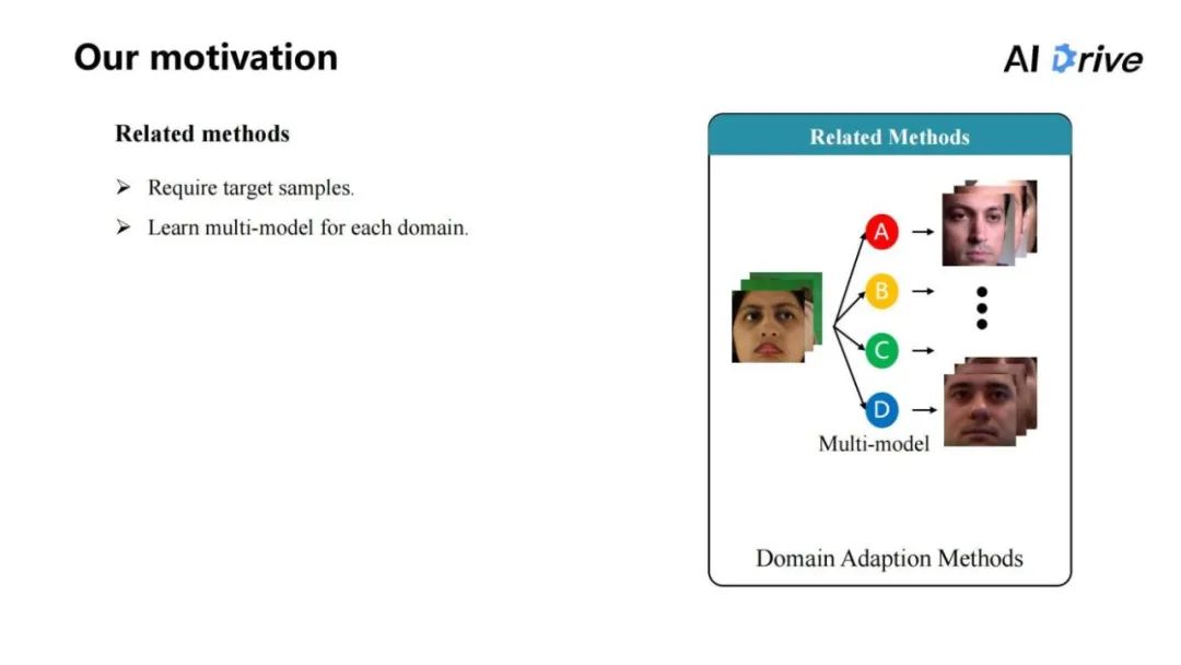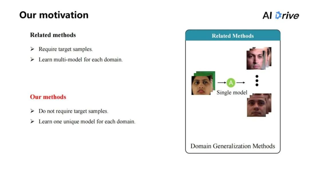 而对于我们的方法来说,主要想要解决的是如何不需要且不利用目标域的数据,因为这样相当于局限了整个模型。我们期望能在原始的数据集上学习模型,而这个模型把它同时应用到多个模型上,也都能达到比较好的结果,于是我们采用了域泛化的方法。